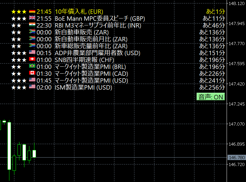 EventButlerは、MT5のチャート上に「次に来る経済指標」を表示し、読み上げとビープ音でお知らせする高機能インジケーターです。