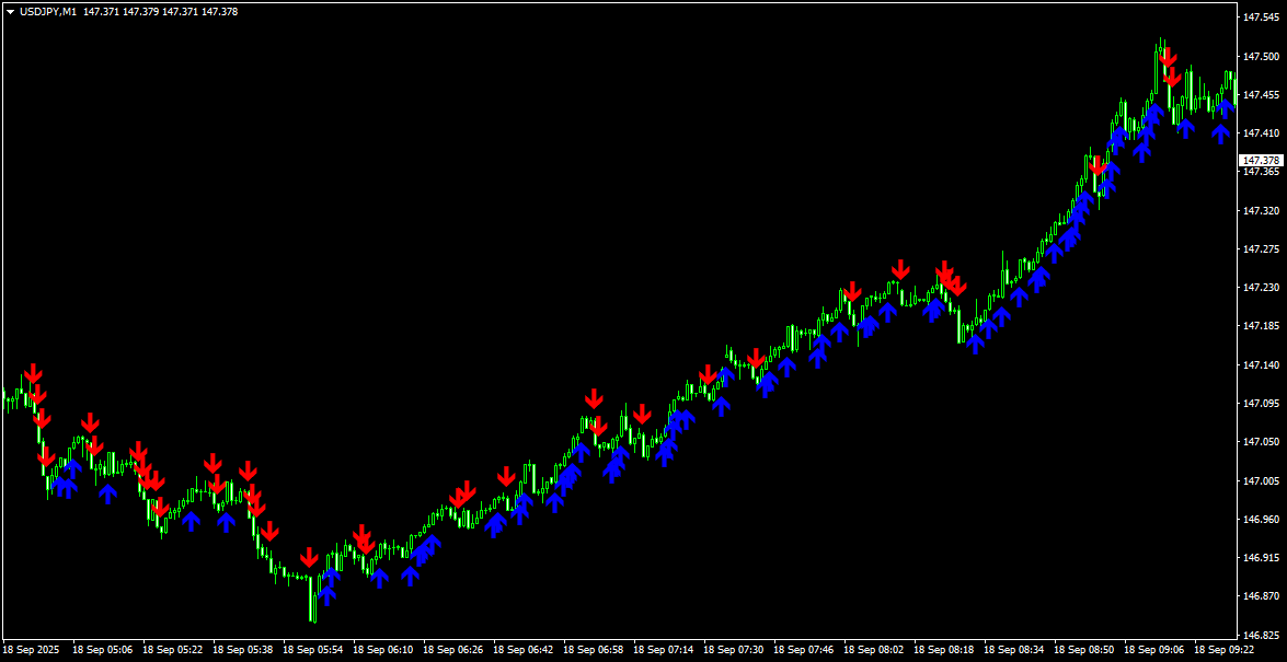 ローソク足の形状から相場の進む方向へ向かって矢印が発生するロジックで設計しています。