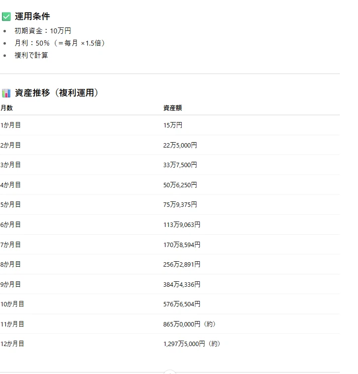 下の画像は、例として「月利50%」を目標にした場合の複利運用シミュレーションです。