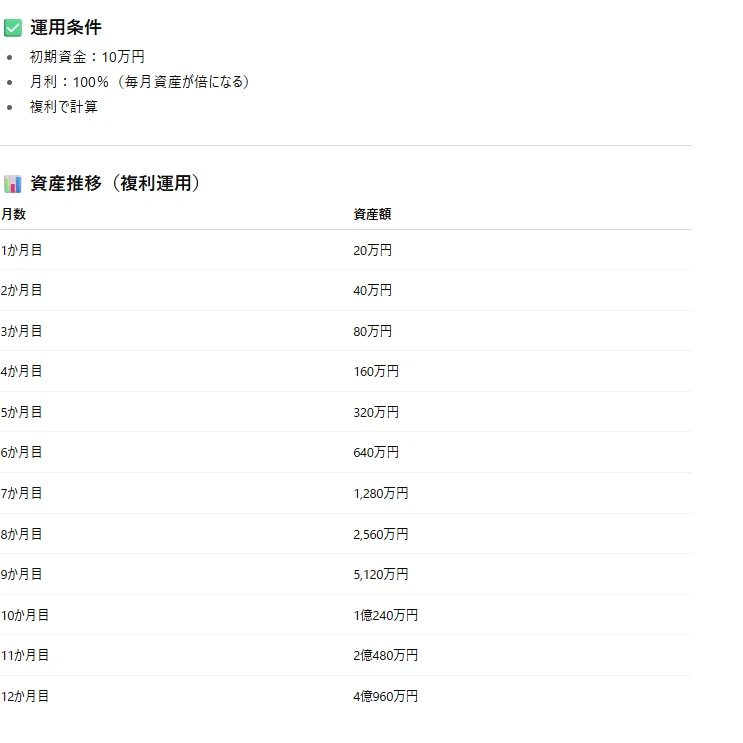 「月利200%」のシナリオを考えると、単純計算では1年で数億円に膨らむ計算になります。