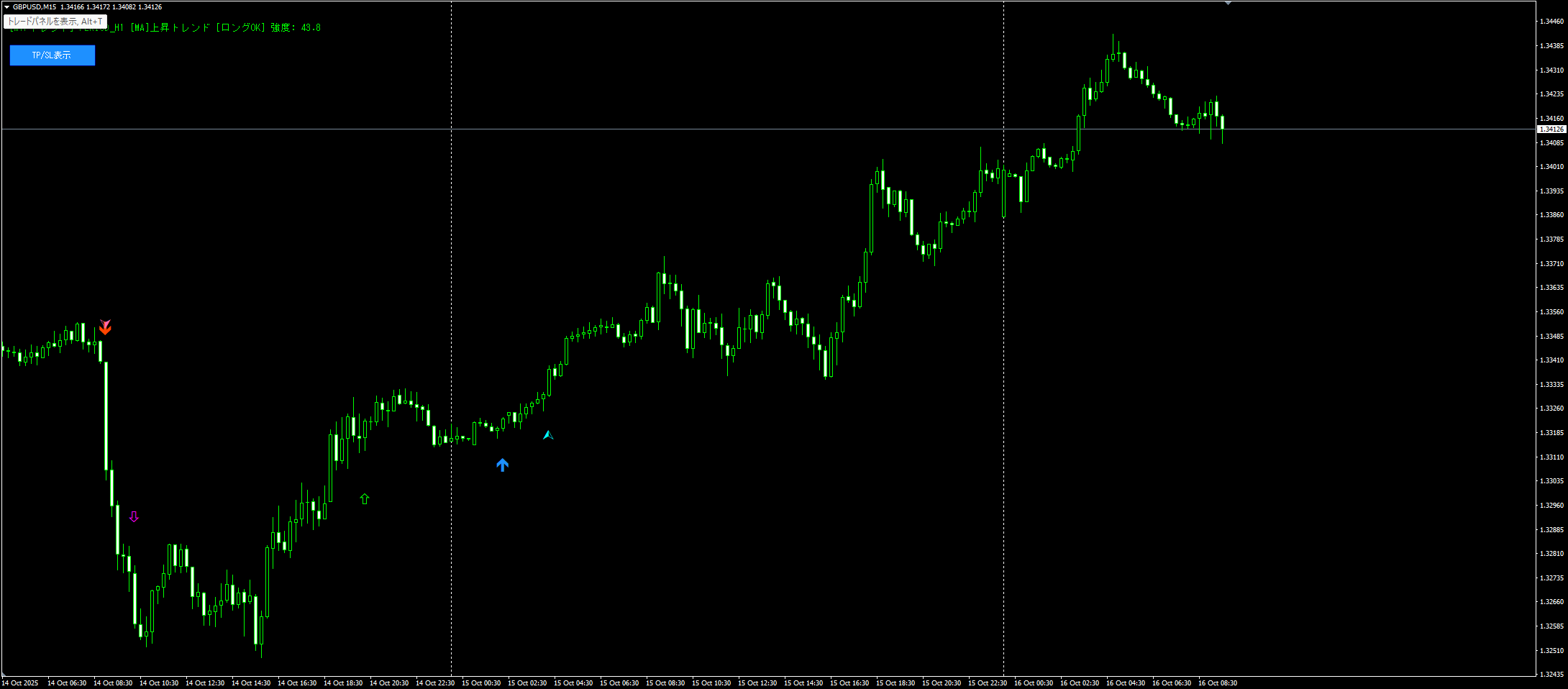 自動TP/SL表示ATRベースまたは固定pipsでの利確・損切りラインを自動表示リスク管理を自動化。感情的な判断を排除