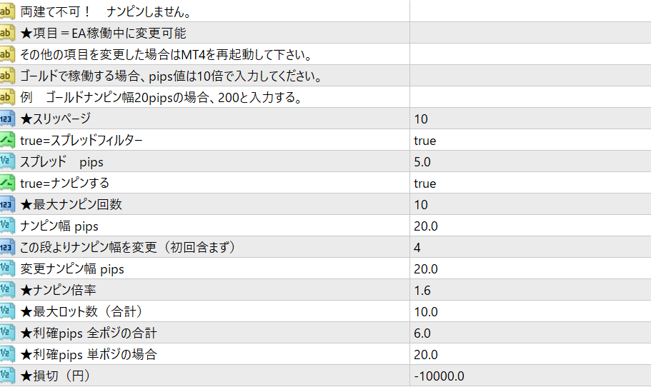 ※変更ナンピン幅 ナンピン幅を変更できます。『この段よりナンピン幅を変更(初回含まず)』が4の場合は、EAによるナンピンポジション4段目から適用されます。