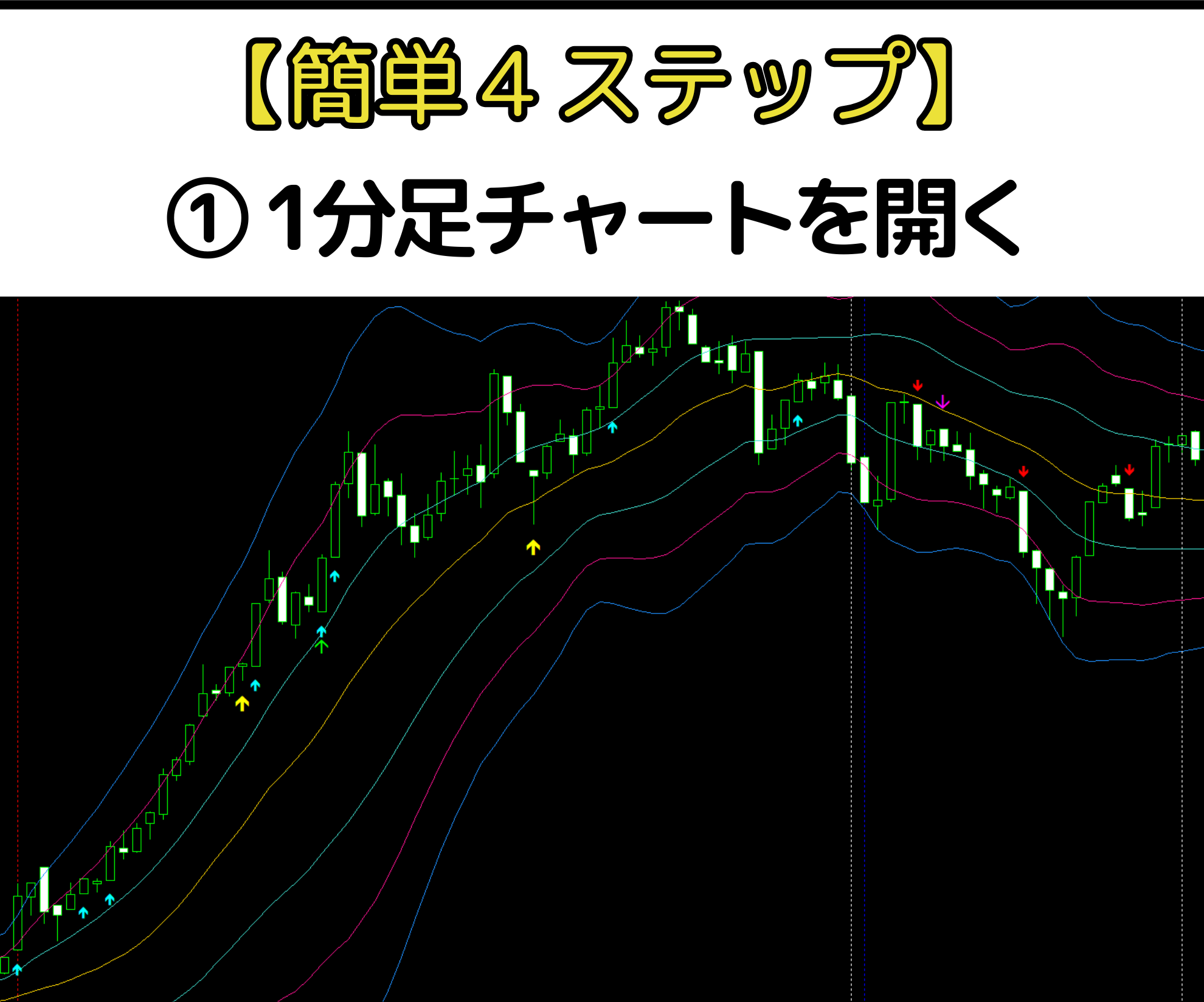 ① インジケーターを導入し、1分足チャートを開く