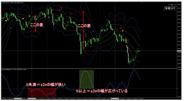 → BB幅を相対値でライン表示。トレンドの始まり・終わりを判断