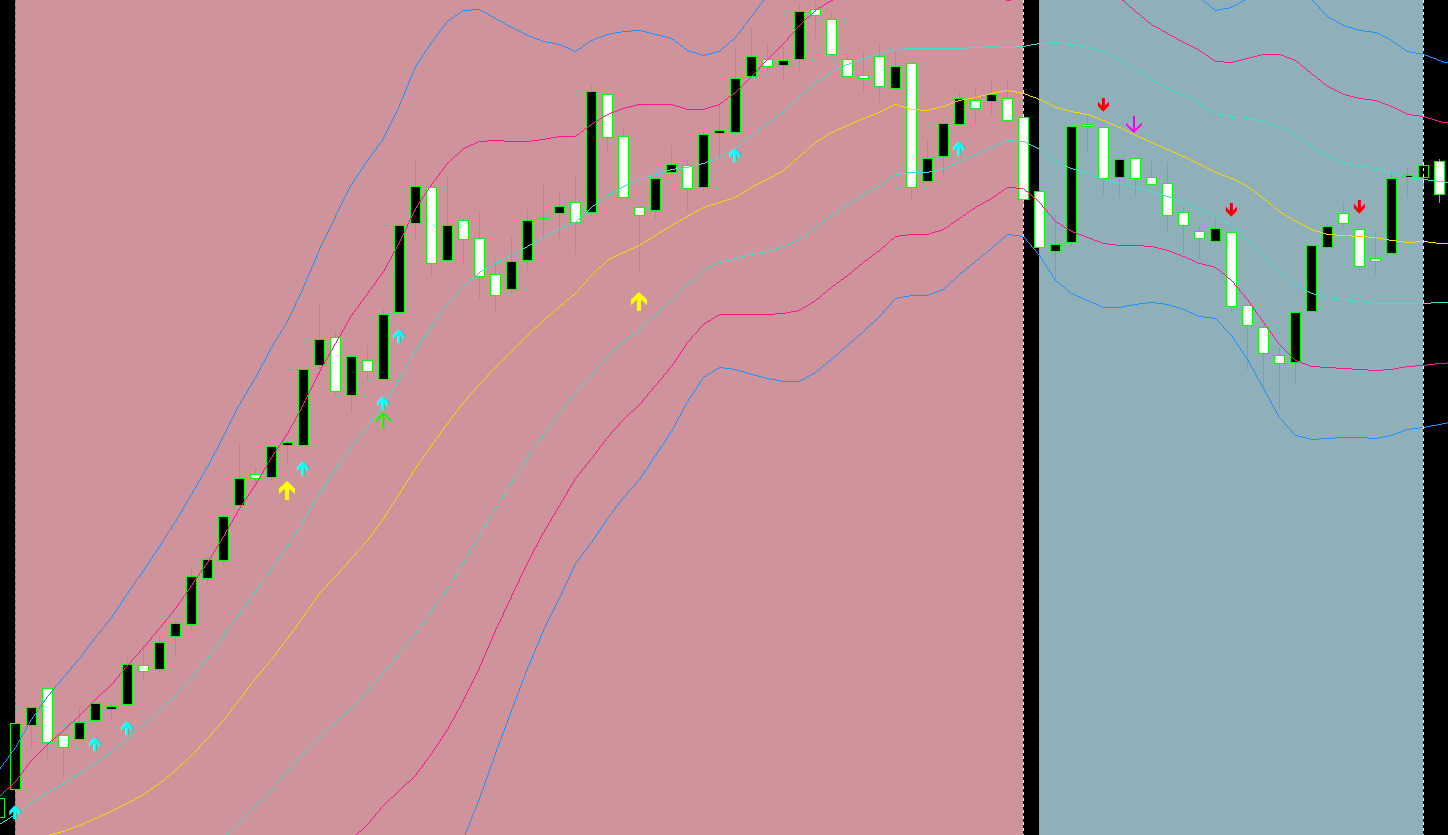 さらに、背景色(上昇=ピンク、下降=ブルー)でトレンド方向が一目で分かるため、逆張りエントリーを防ぎ、順張りの精度が格段に上がります。