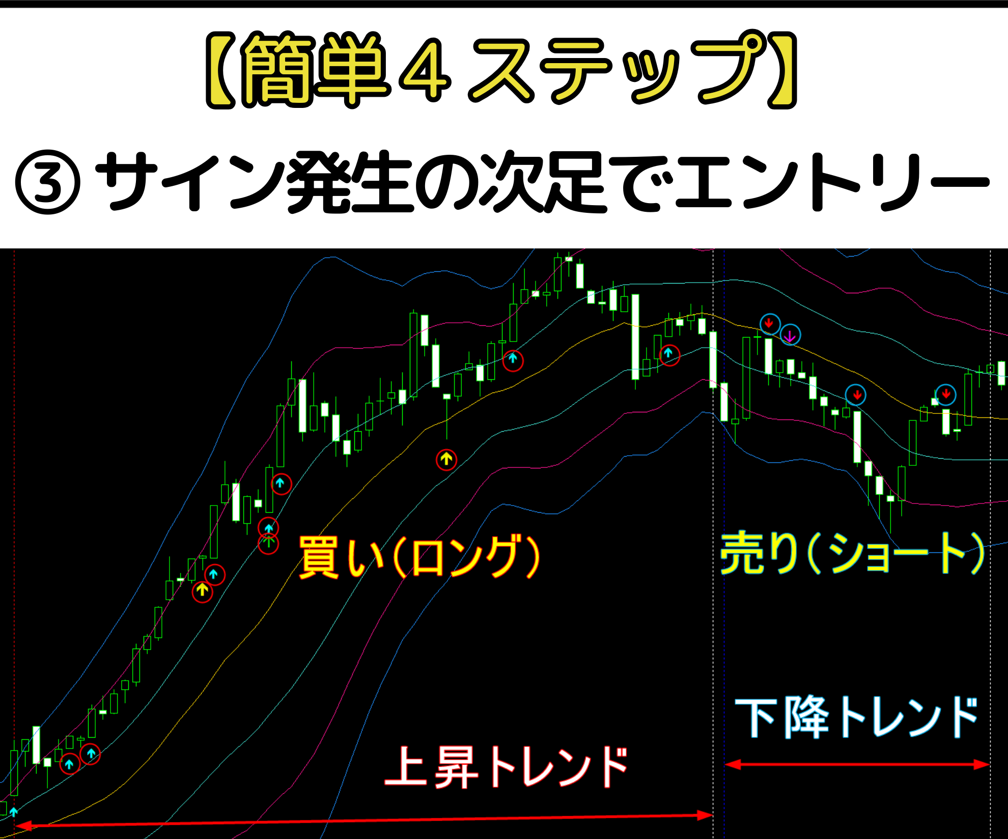 ③ 矢印サインが発生 → 次の足開始で成行エントリー