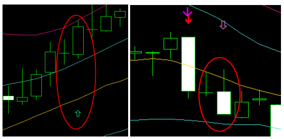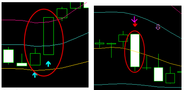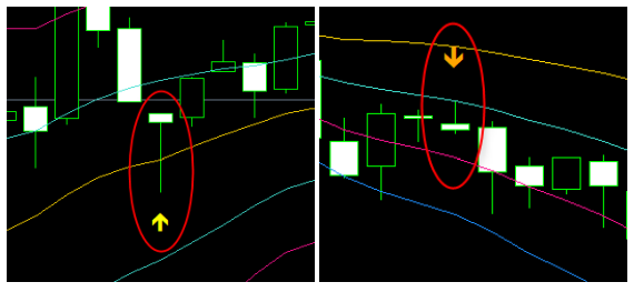 本インジケーターは、ローソク足の形状とボリンジャーバンドの動きから、以下4種類のサインを自動検出します。