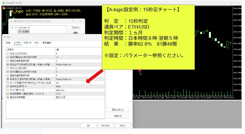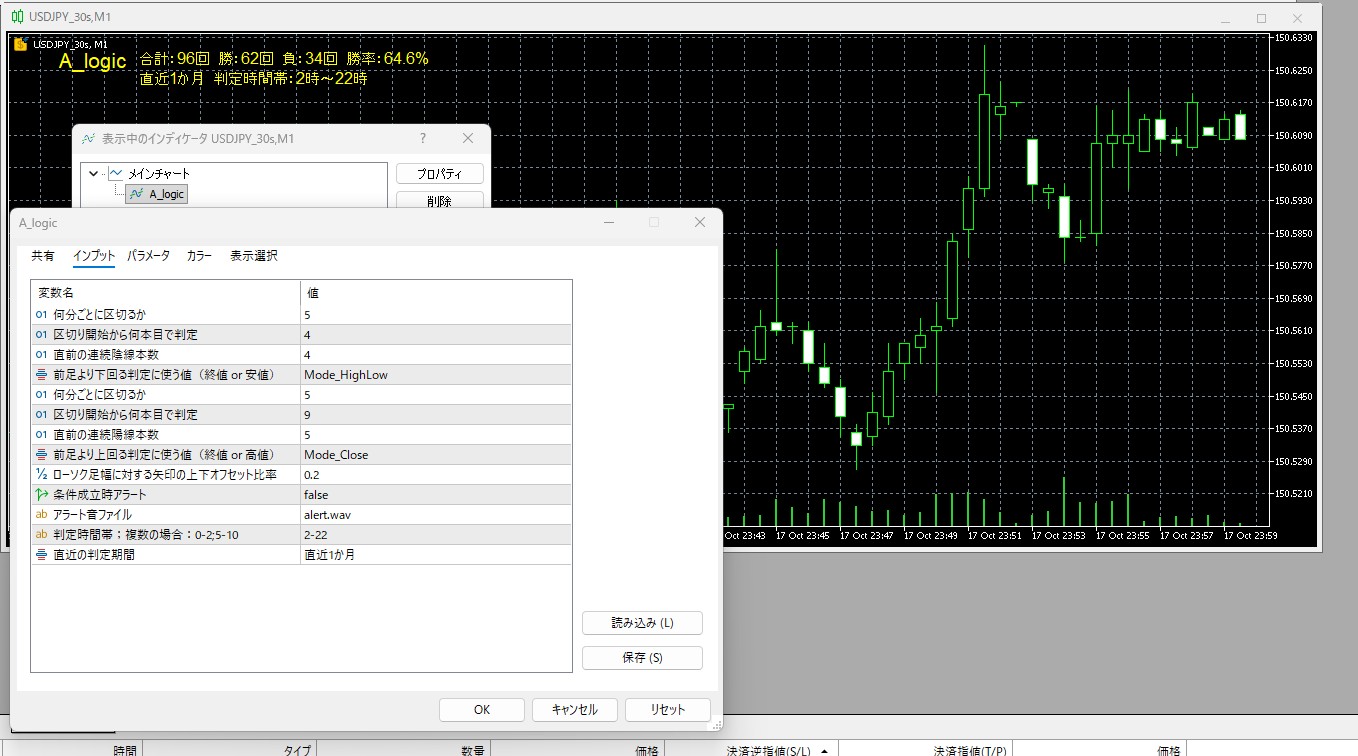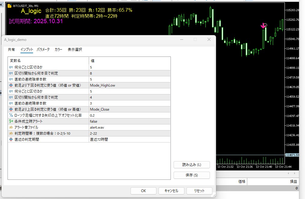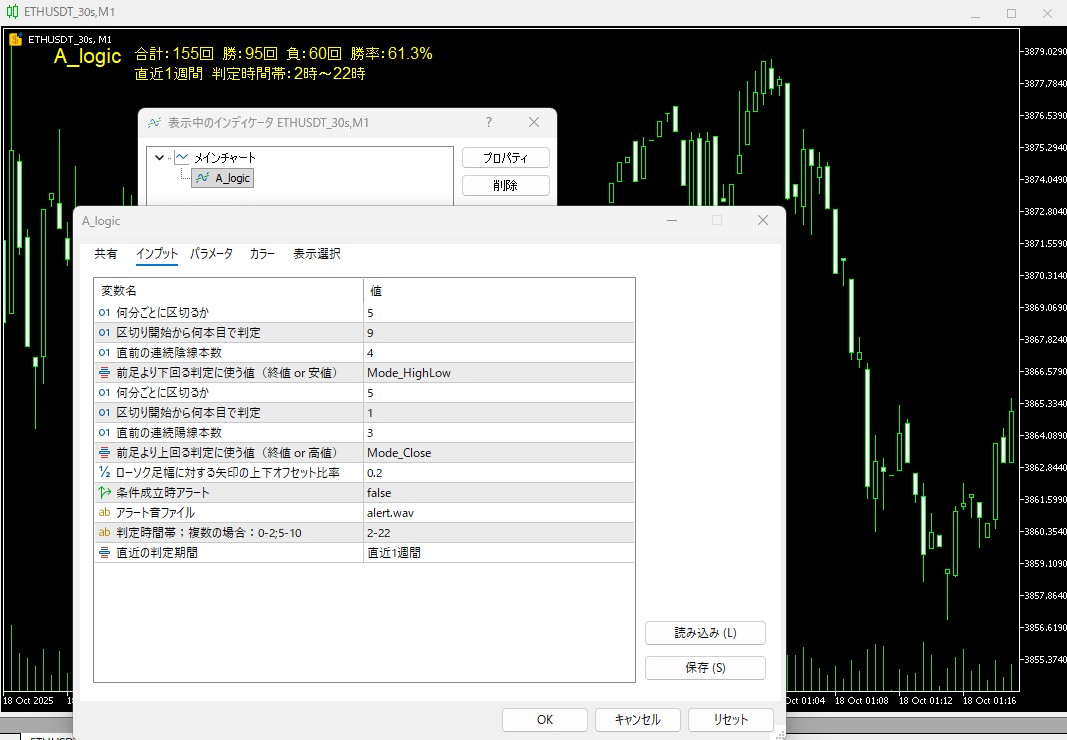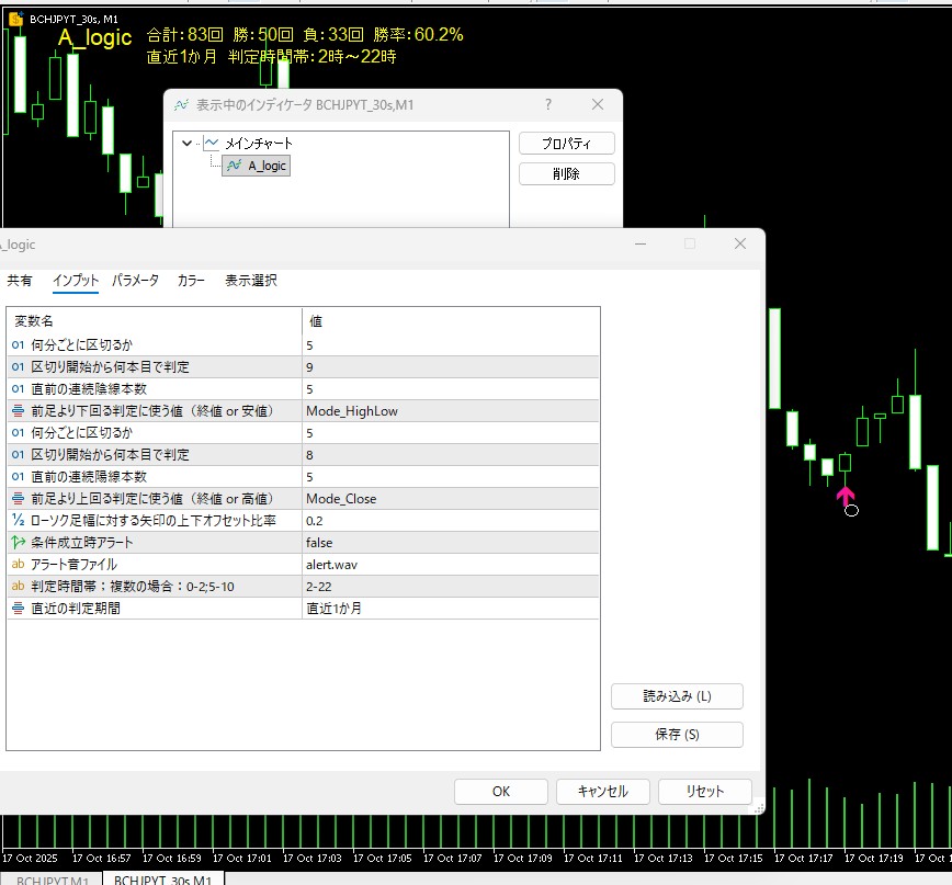 下記、無料ダウンロード可能EAによるお手軽形成した30秒チャートにA-logicを導入してパラメータを設定しました。
