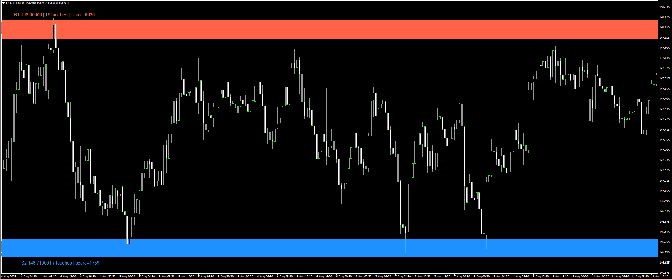 本品は「最近タッチされたレベル」に高い重みを置く独自のスコアリングシステムを採用。相場で実際に機能している重要ラインだけを抽出します。