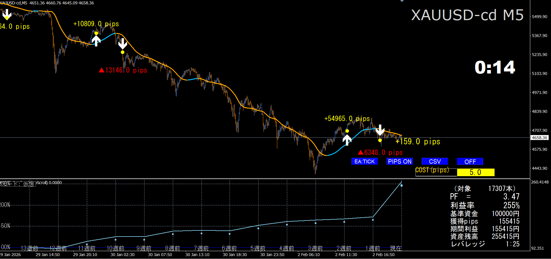 · 黄色/赤色のpips文字:シグナル間の確定損益(+は黄色、負は赤+▲)