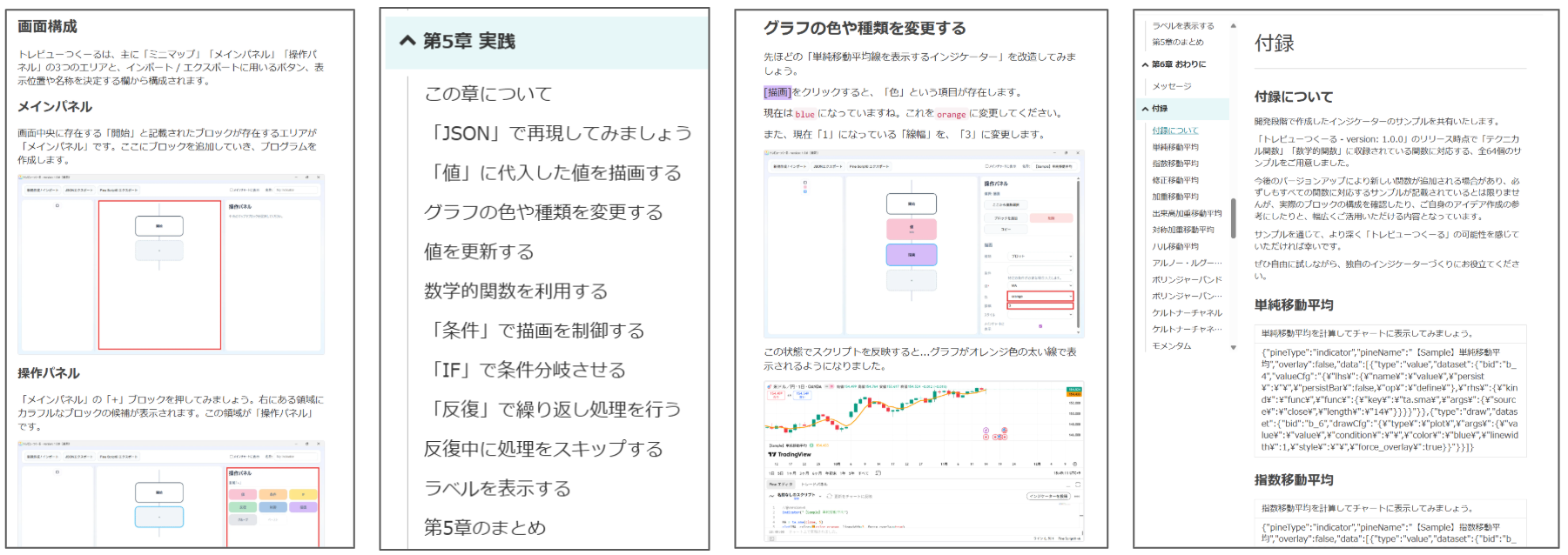 - マニュアルには、そのトピックで解説中のインジケーターを再現するための設計図・JSONファイルが記載されています。お手元のPC上でブロックの状態を完全再現した状態で読み進めることが可能です。