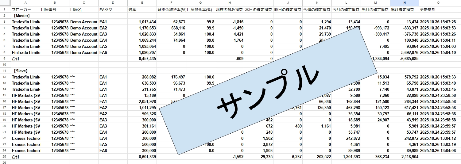 8.複数口座一元管理:スマホで複数口座の状況をリアルタイム表示・集計。残高、証拠金維持率、確定損益【本日、昨日、今週、今月、累計】の可視化