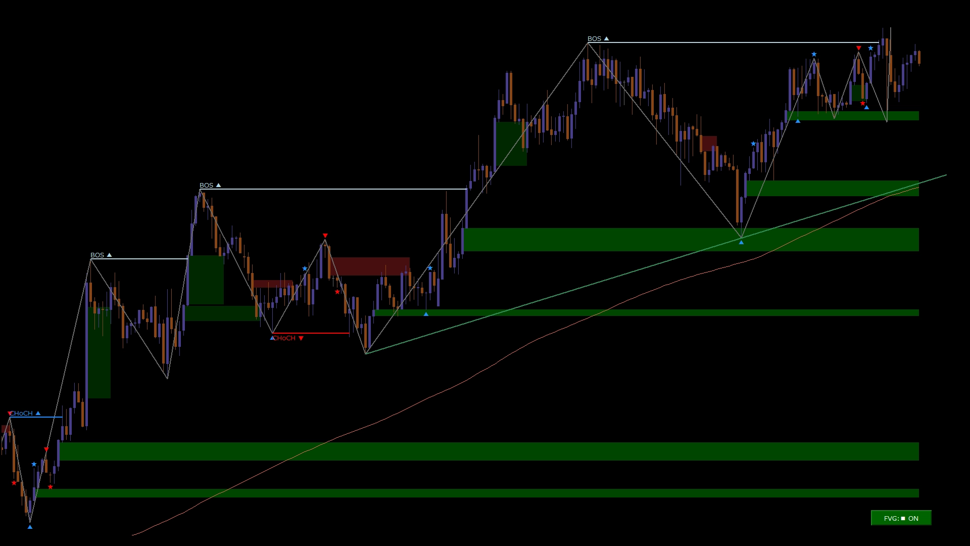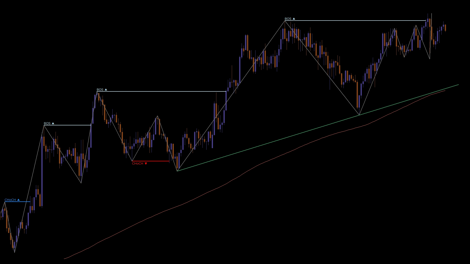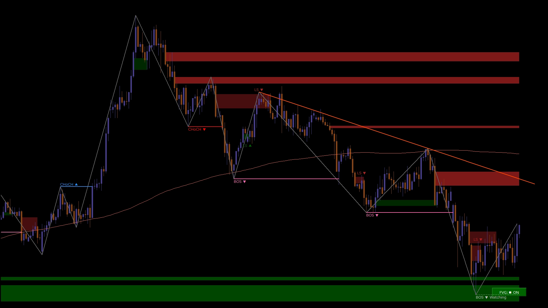 CHoCHやBOSを自動検出し、相場の転換や継続を視覚的に把握できます。
