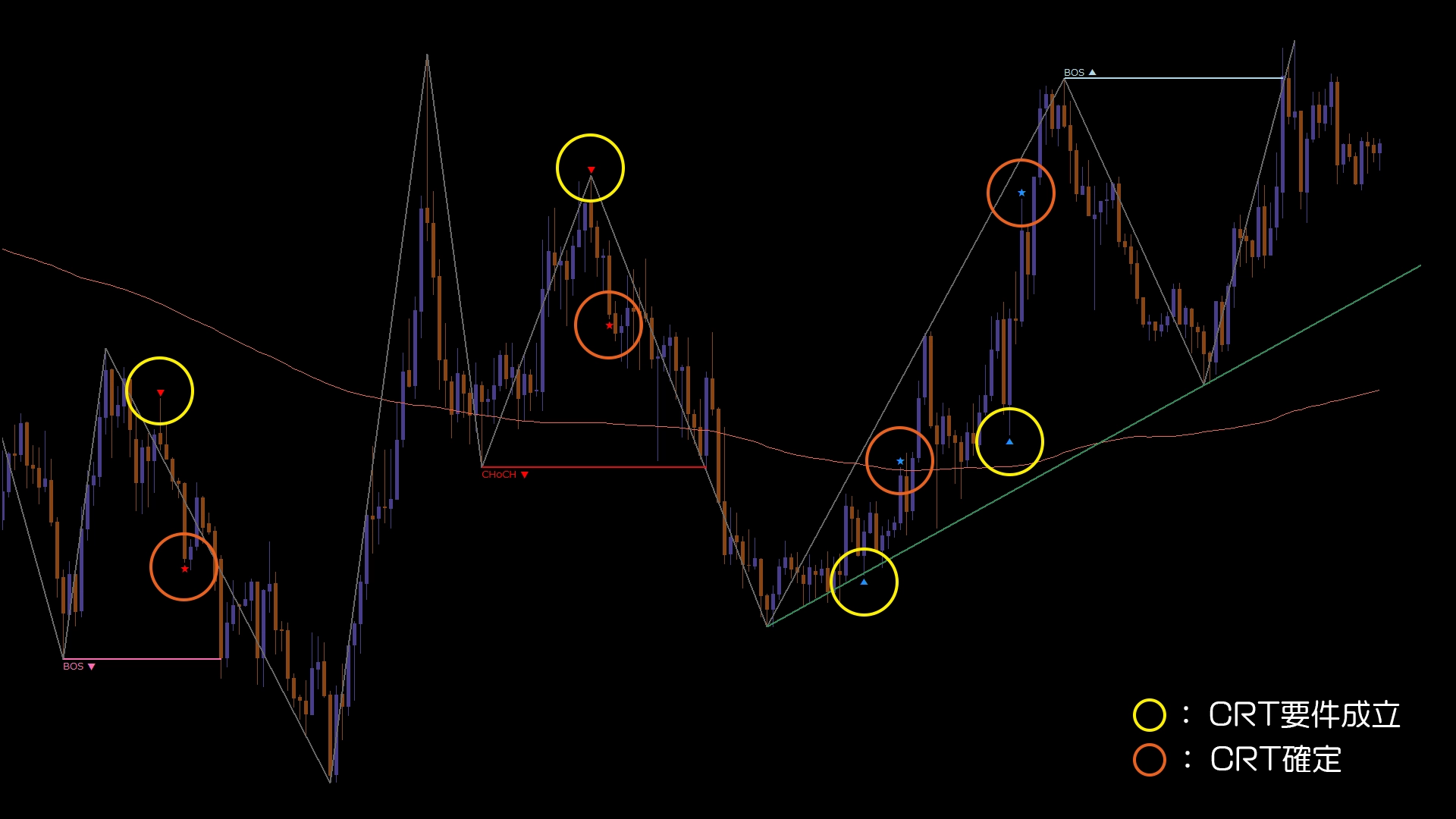 DWMが構造変化(CHoCH/BOS)を検出するのに対し、CRTはその直前で起きた値動きの強弱バランスの変化を可視化します。