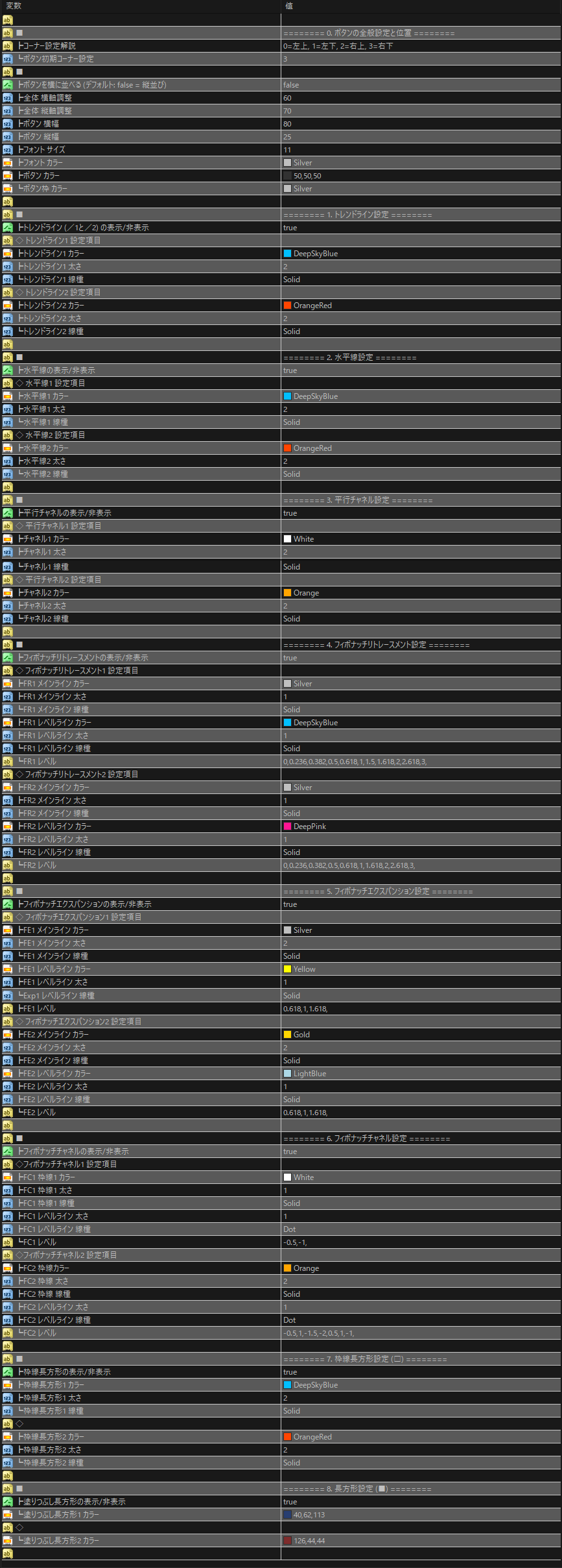 チャートの拡大縮小やトレンドライン、水平線、チャネルライン、フィボナッチリトレースメント、フィボナッチエクスパンション、フィボナッチチャネル、長方形枠線、長方形塗りつぶしを各2種類ずつボタン操作一つで描写できるようにしたインジケーターです。