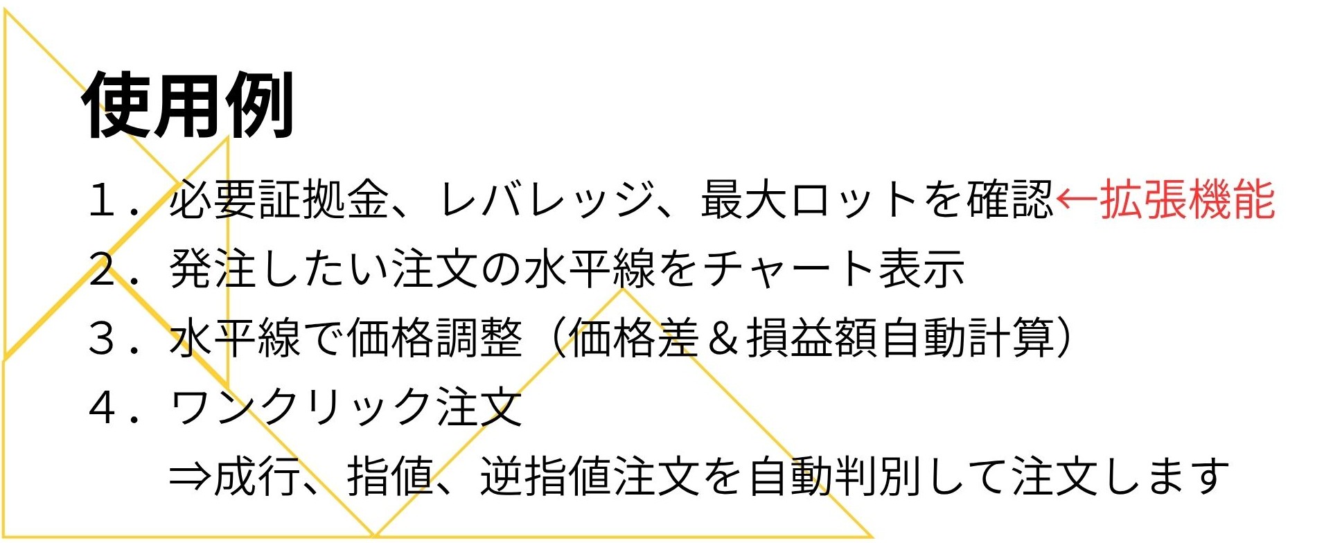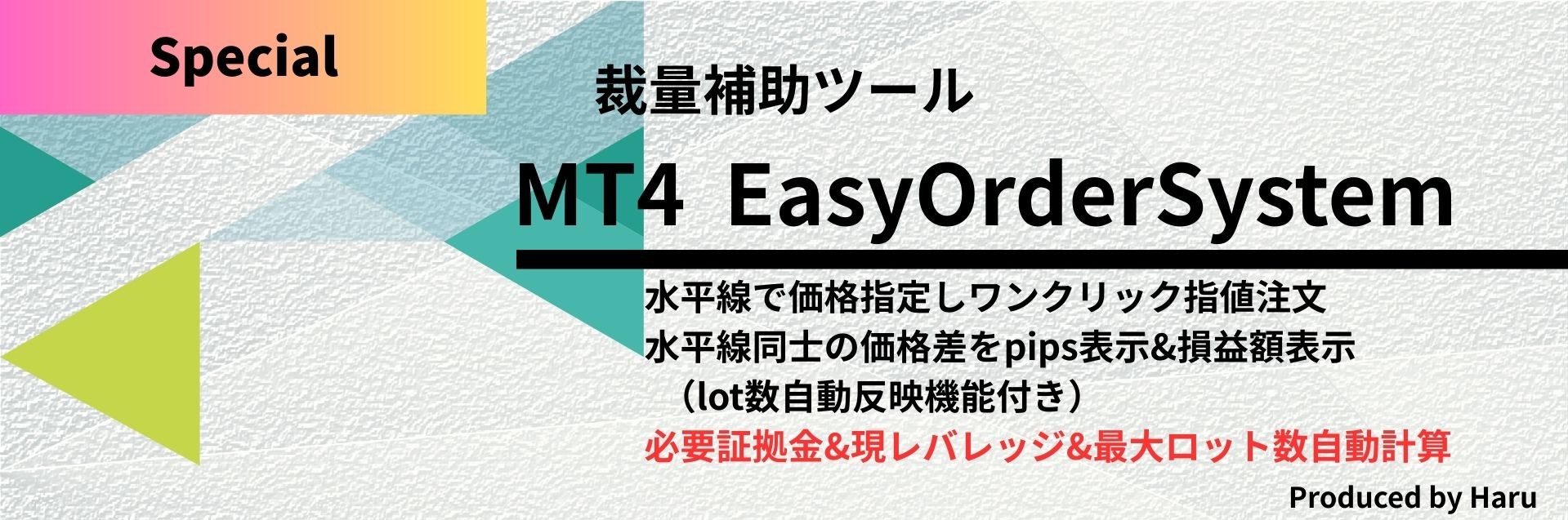 あらゆる取引の場面で役立ちますが、特に、ロットを柔軟に変更するトレードスタイル、複数ポジションを保持するトレードスタイルで活躍してくれます。