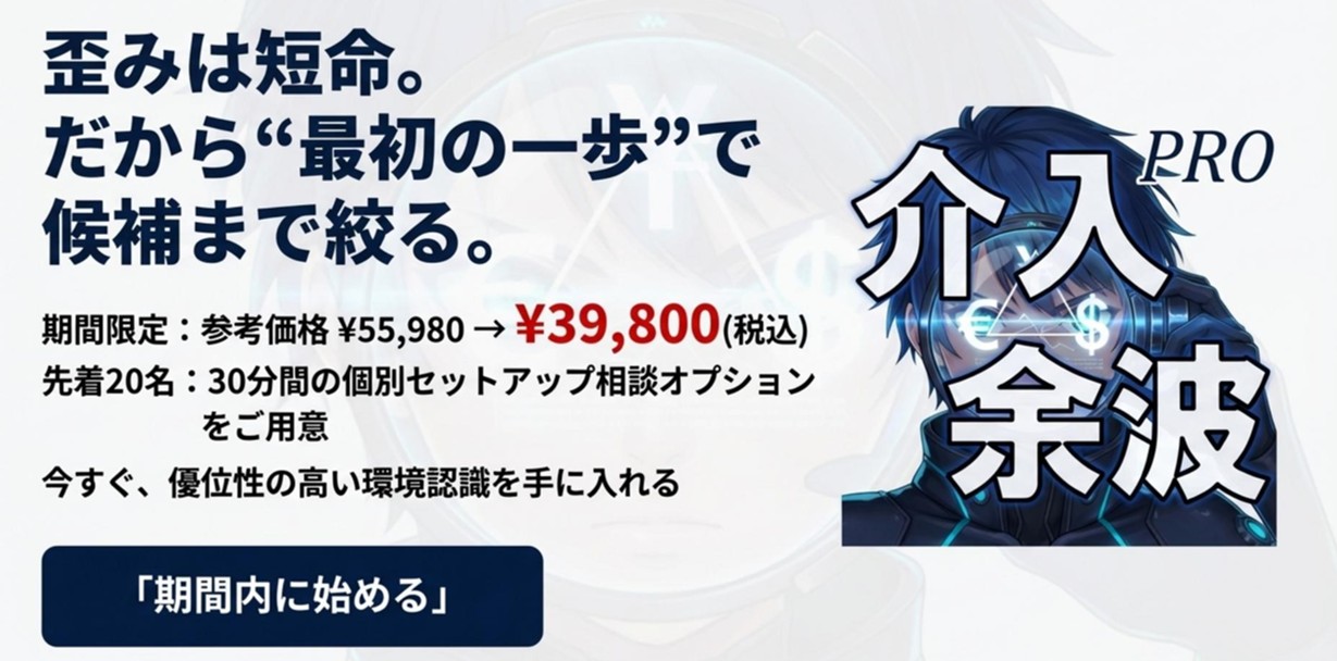 歪みは短命。だから“最初の一歩”で候補まで絞る。 三通貨パリティの「介入余波(=歪み)」を炙り出し、均衡へ戻る局面だけを狙うインジケーターパッケージです。