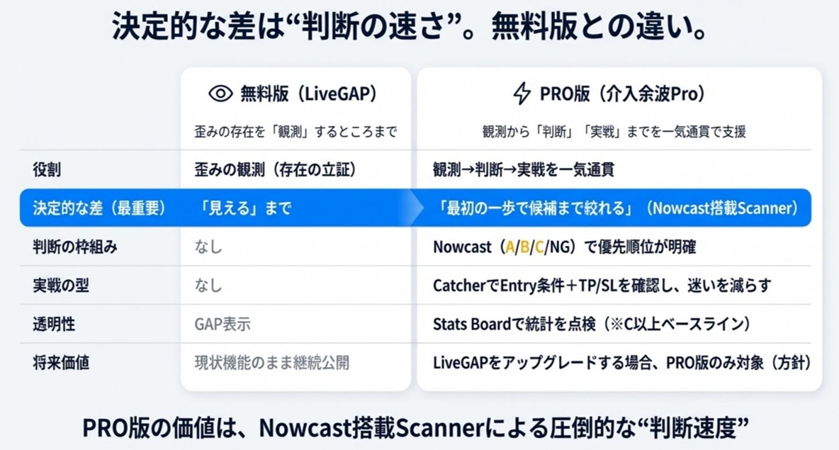 LiveGAP=観測。PRO=判断と実戦。LiveGAPは「歪みが本当に存在するのか?」を観測できる入口です。PROは、観測を 判断実戦 に落とす導線を持っています。