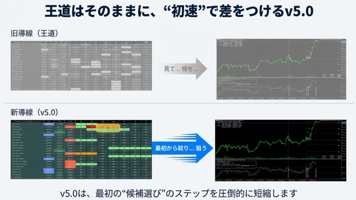 歪みは永続しません。見つけるまでに時間がかかれば、その局面は既に終わる。v5.0「最初の一歩」を短くし、短命な局面での機会損失を抑えやすくしました。