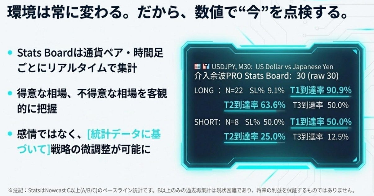 • 統計ダッシュボード(Stats Board):判断の補強(置き換えではない)