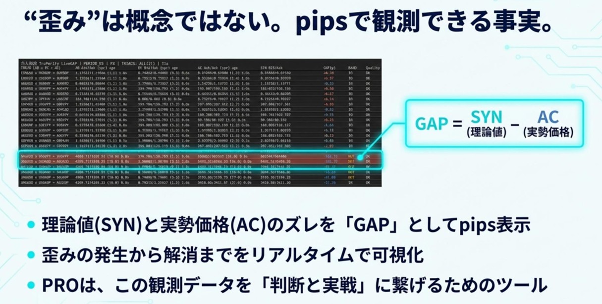 LiveGAPは、理論価格(SYN)と実際の価格(AC)の差分をGAPpips)として表示し、歪み(GAPのこと)の発生と解消をリアルタイムで観測できます。 「歪みの立証と観測」の入口として機能します。