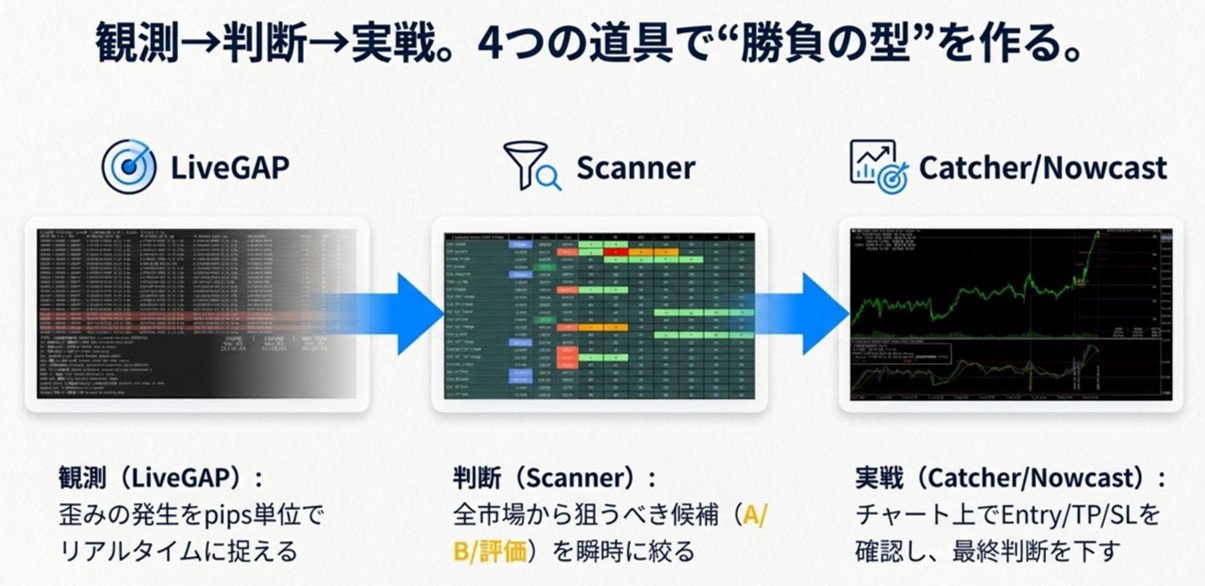 • ScannerにNowcastを搭載し、意思決定プロセスを大幅に迅速化しました。 Scanner上でNowcast評価(A/B/C/NG)を同時に確認できるようになり、“見るべき通貨ペア/見送るべき通貨ペア”を即時に選別できます。これにより、従来よりも迷いが減り、判断が速くなる設計になりました。 LiveGAPの追加 三角通貨パリティに基づく理論価格(合成)と実勢価格の乖離(GAP)を可視化し、「歪みの発生→収束」を観測しやすくしました。(テスターでも再現可能です。)