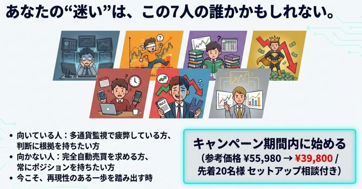 • 多通貨監視で疲弊し、判断が遅れがちな人(A/B抽出で監視量を減らす)