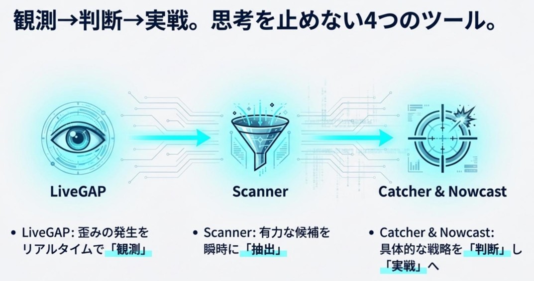 さらに、現在別途無料提供しているLiveGAP(理論価格と実勢価格の乖離監視)を追加し、「環境把握→狙い撃ち」の導線を強化しています。