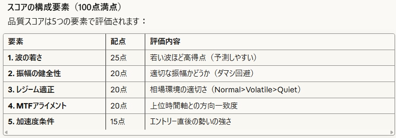 - 波の年齢、振幅、トレンド整合性など複数要素を総合評価