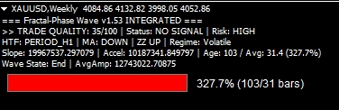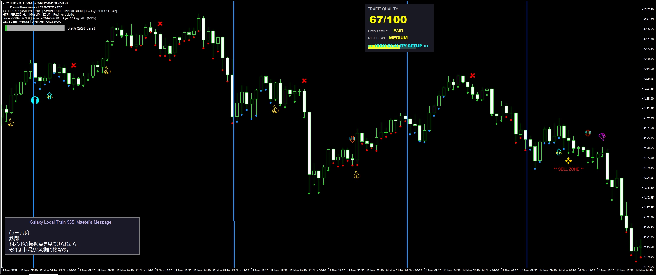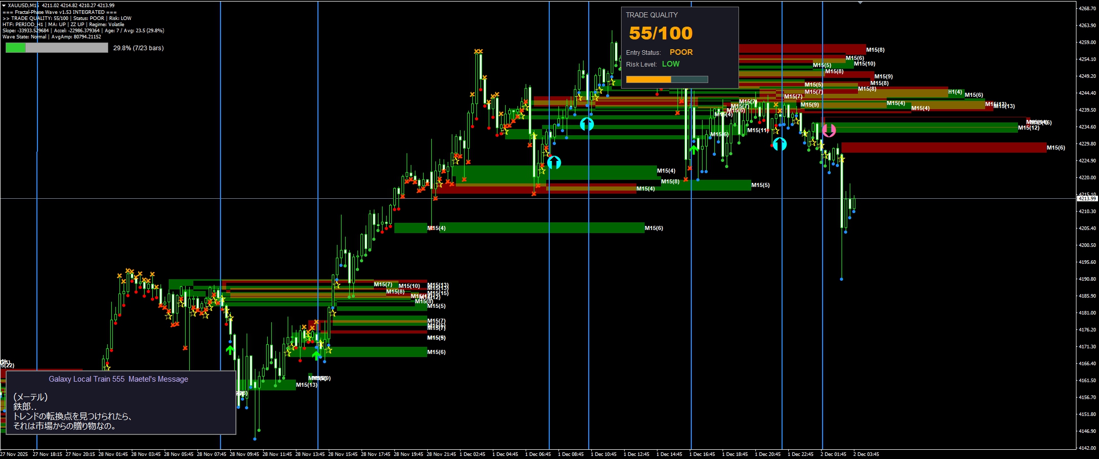 (メーテル) 「鉄郎...波スコアが真っ赤になっているわ。 これは、波が寿命を大きく超えている証拠。 いつ反転してもおかしくない危険な状態よ。 もしポジションを持っているなら、 今すぐ手仕舞いを検討して。 利益が出ているなら、それを守ることが大切。 もしこれからエントリーしようとしているなら、 絶対にやめておきなさい。 たとえどんなに魅力的に見えても、 波の末期でのエントリーは自殺行為よ。 次のチャンスは必O来るわ。 新しい若い波(緑色ゾーン)が始まるまで、 辛抱強く待つことも、 立派なトレード戦略なのよ。」という意味合いです。