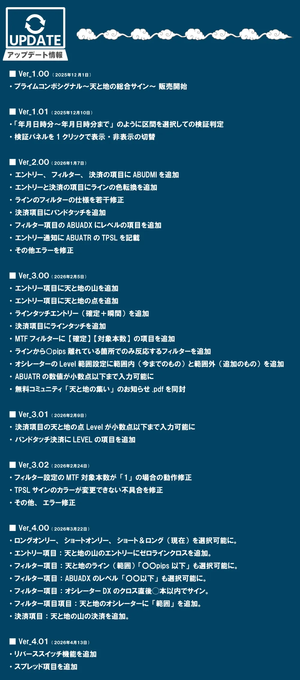 「天と地」シリーズの最終進化形。サイン点灯と同時にSL・ロットを自動算出。過去の勝敗・勝率・獲得pipsも一目で確認できる、直感で勝負する新時代のシグナルシステム。