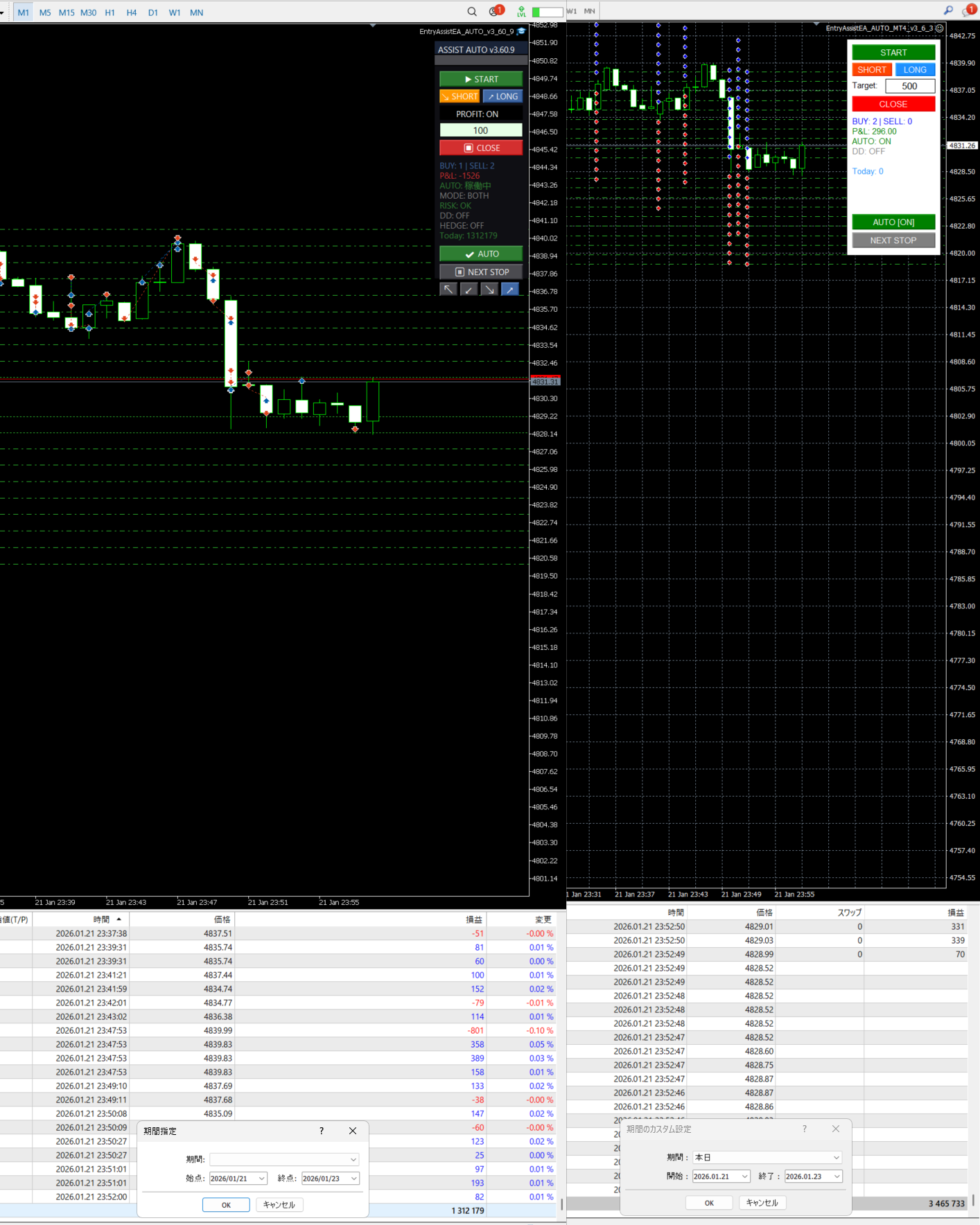 昨日朝から1月27日10:15現在まで MT5間隔15pips/500円+238,759円 MT4間隔10pips/500円+1,373,820円