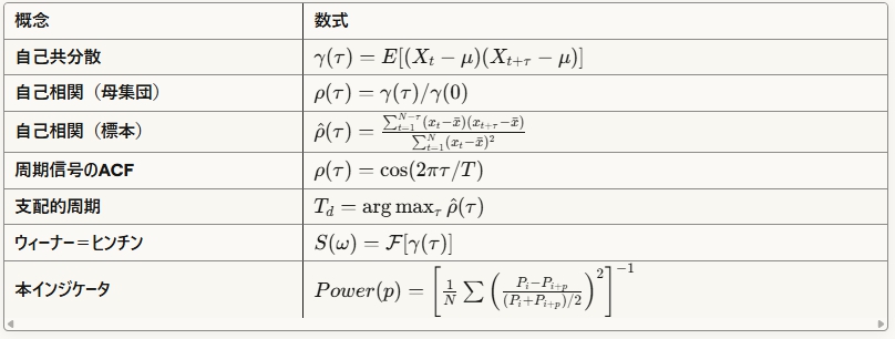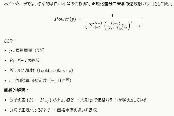 このインジケータは、自己相関分析という手法を使って、この複雑な波の中から「いま最も支配的な周期」を見つけ出します。