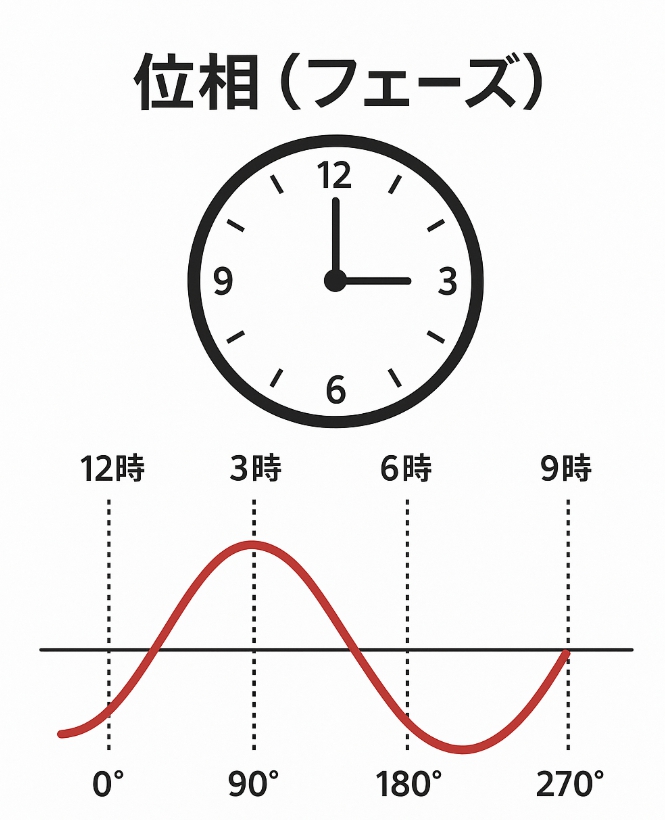時計を思い浮かべてください。時計の針は12時から始まって、3時、6時、9時と進み、また12時に戻ってきます。これが1周期です。「いま何時?」という問いに答えるのが、位相を知ることです。