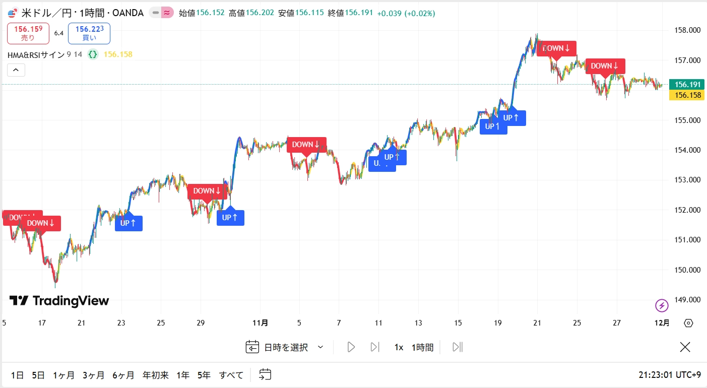 本商品の「商品マニュアル」に記載されたPine Script®のコードを、TradingView®のエディタに貼り付けてチャートに適用することで、メインチャート上にRSIの値によって色分けされたハル移動平均線と、UP・DOWNのサインが表示されます。