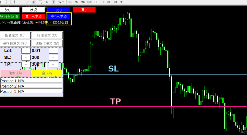 | 「売り水平線」描写機能 | 直近高値にSL 直近高値にTPを描写 |