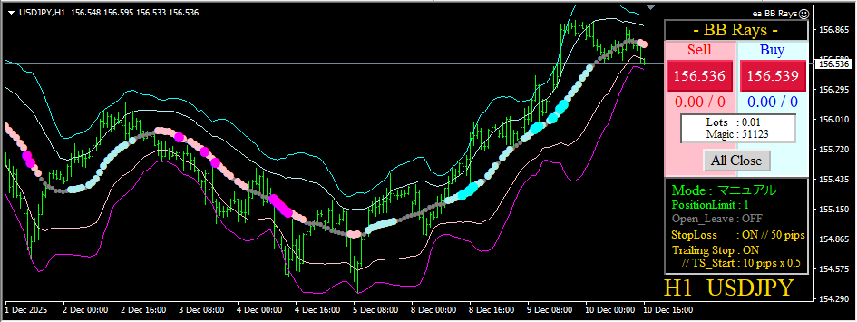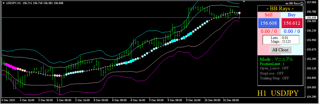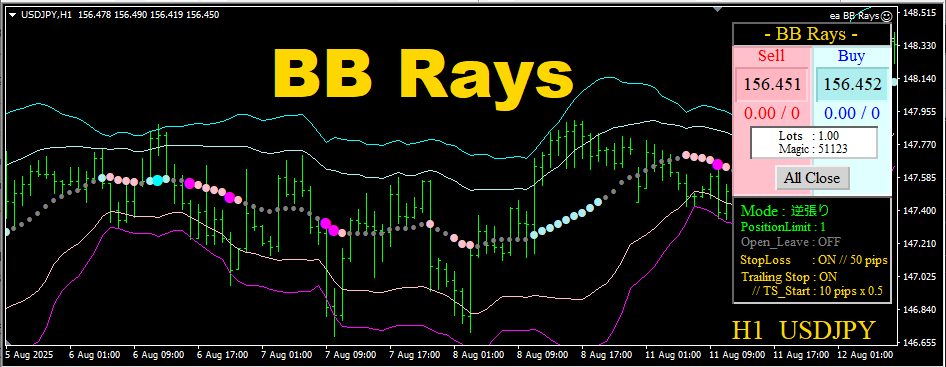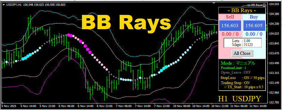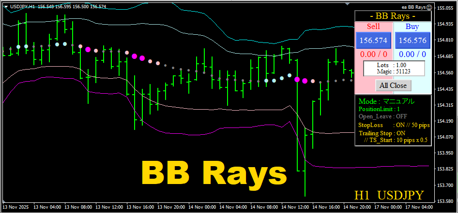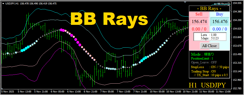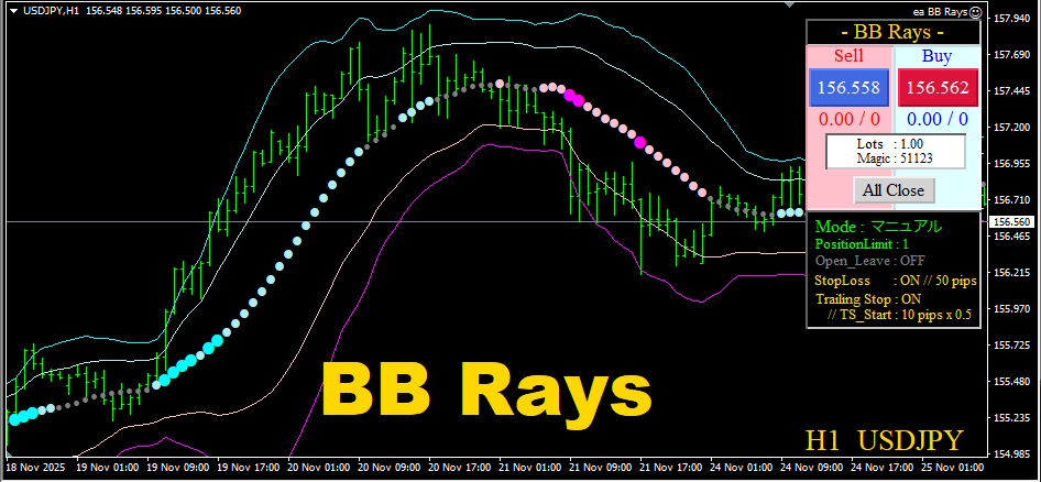 ■BB Rays(ビー・ビー・レイズ) このインジケータは順張りと逆張りの両方に有効的で、相場の流れに合わせたトレードを行うことができます。 多くの相場、通貨ペアや時間足に対応できる万能型インジケータです。 この優れたインジケータを効率よく活用するために、ただいま、高機能な取引ツールをお付けしています。 これ一つで、手動での裁量、決済のみを自動で行う半裁量、全自動での順張りと逆張りの全てを行うことができます。