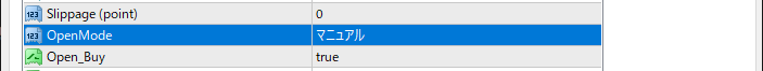 【手動での裁量トレード】 「OpenMode」を「マニュアル」に設定します。 取得・決済の両方を自分のタイミングで行いたい場合や、他のツールも見ながらトレードを行いたい場合などにはこのモードを利用します。