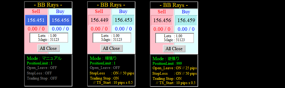 ■『BB Rays』 の取引ツール このインジケータには取引を有利に、そして確実に行うためのツールがついています。 これ一つで、手動での裁量、決済のみを自動で行う半裁量、全自動での順張りと逆張りの全てを行うことができます。