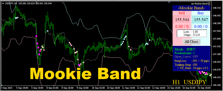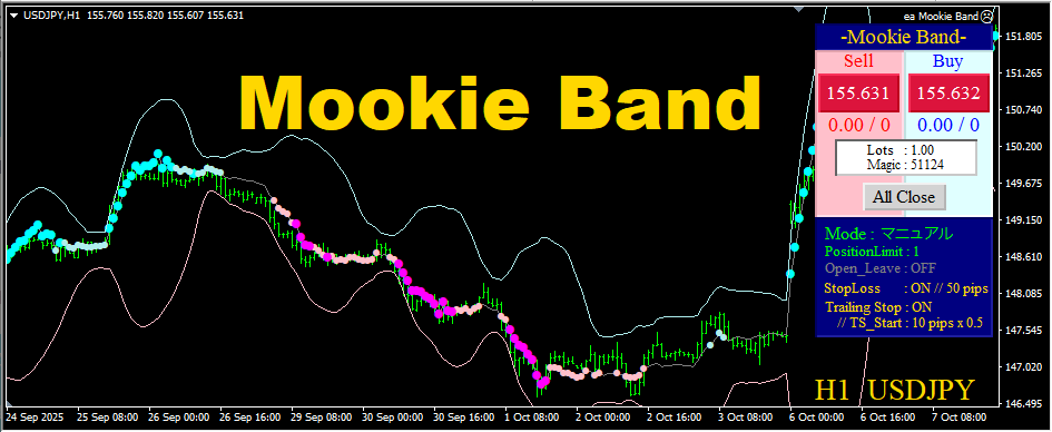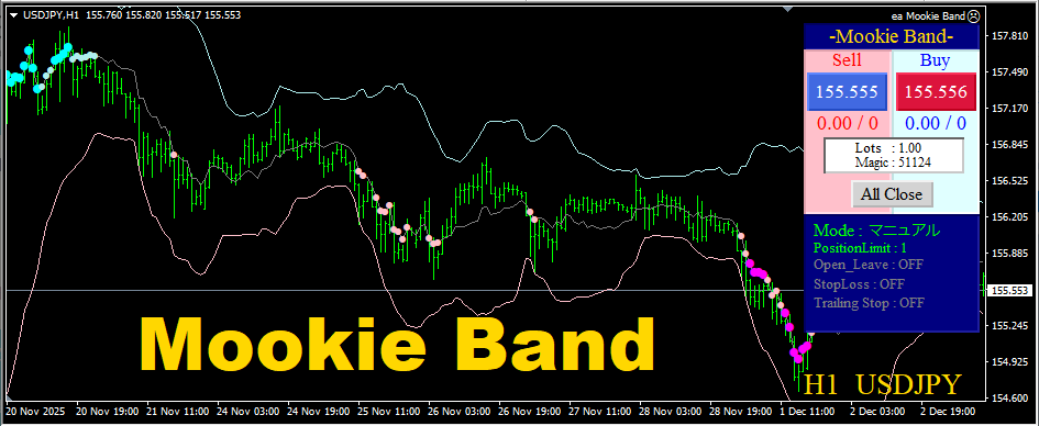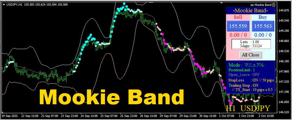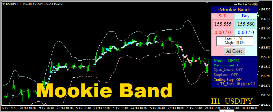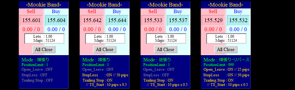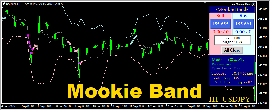 取得・決済にはいくつかのモードが用意されています。 自動決済も装備されていますので、ご自身に合わせたトレードスタイルを強力にサポートしてくれます。 フルオートでの順張りでは、2通りのモードが装備されているのも『Mookie Band』の大きな特徴といえます。