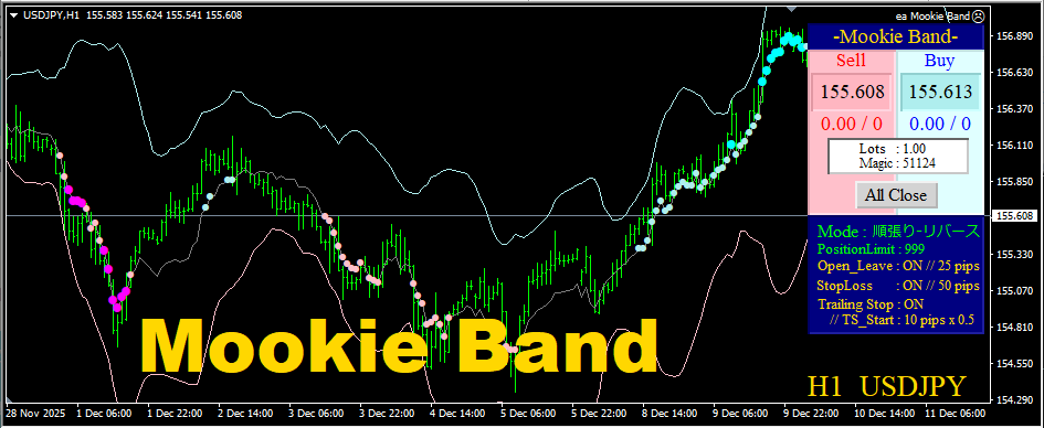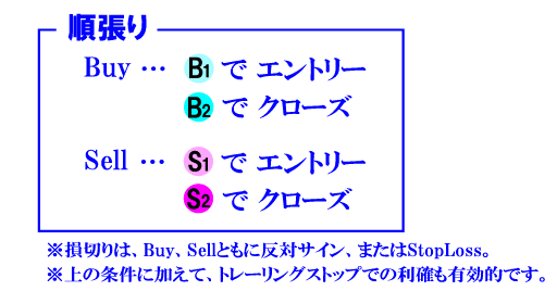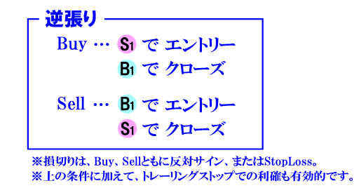 【フルオートでの順張り-リバース】 『Mookie Band』の特徴のひとつが、この「順張り-リバース」です。 「順張り」と取得タイミングは同じですが、決済タイミングが異なります。 反対サインでの決済です。 同一方向に継続的な値動きがあるときに大きな利益を獲得することができます。