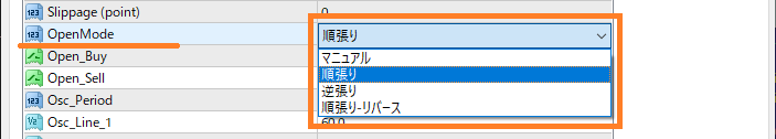 【フルオートでの順張り】 「OpenMode」を「順張り」に設定します。 取得と決済の両方を自動で行うことができます。