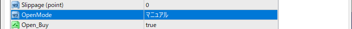 【手動での裁量トレード】 「OpenMode」を「マニュアル」に設定します。 取得・決済の両方を自分のタイミングで行いたい場合や、他のツールも見ながらトレードを行いたい場合などにはこのモードを利用します。