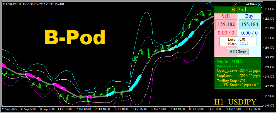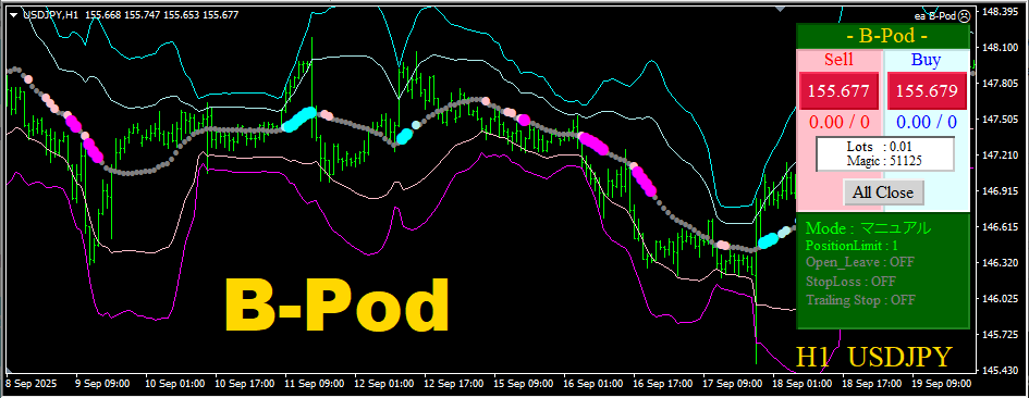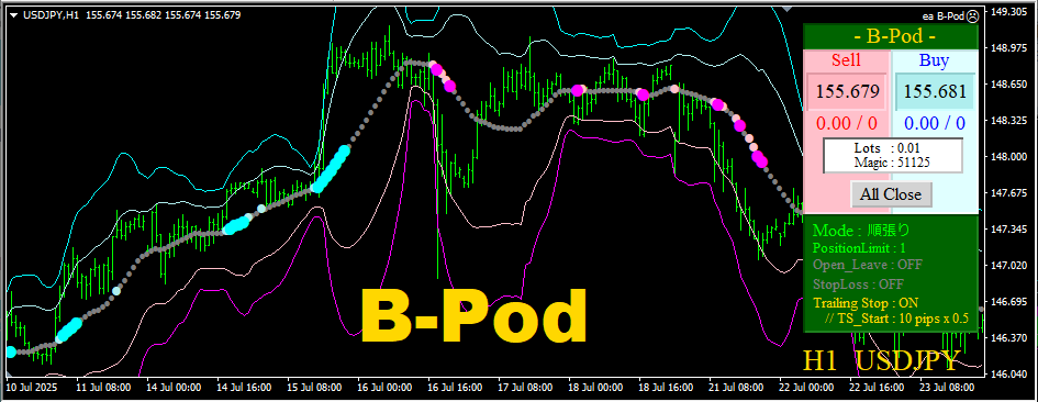 ■B-Pod(ビー・ポッド) このインジケータは内部的に「上昇」、「下降」、「レンジ」のいずれかの情報を常に保持しており、順張り特化した設計になっています。同時公開の『BB Rays(ビー・ビー・レイズ)』と、『Mookie Band(ムーキー・バンド)』とは、ここが大きく違う点です。 「上昇」、「下降」、「レンジ」、そしてその強弱を、ち密かつ高速に計算して把握していますので、今の相場に合わせたトレードを行うことができます。大きなトレンドの発生時には「順張り-リバース」で、大きな利幅を獲得できるのも『B-Pod』の特徴の一つです。