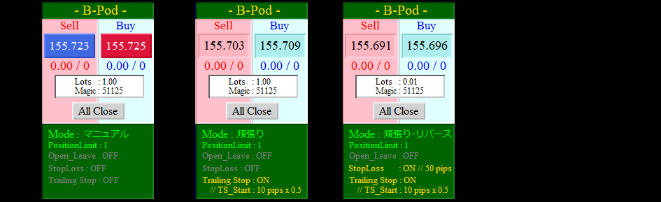■『B-Pod』 の取引ツール このインジケータには取引を有利に、そして確実に行うためのツールがついています。 これ一つで、手動での裁量、決済のみを自動で行う半裁量、全自動での順張りと逆張りの全てを行うことができます。