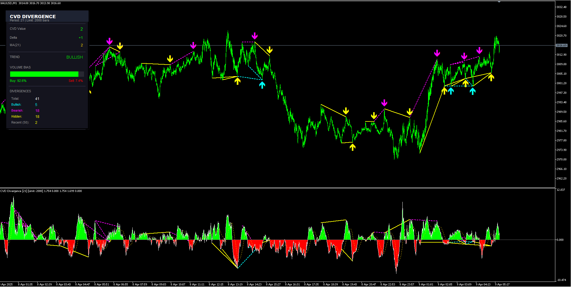 CVDダイバージェンスは、価格と累積ボリュームデルタ(CVD)の間に発生する信頼性の高いダイバージェンスを検出するために開発されたテクニカル指標です。本物の注文フローが価格の動きを裏付けていない状況を正確に捉え、反転、モメンタムの減衰、機関による操作の可能性を示唆します。
