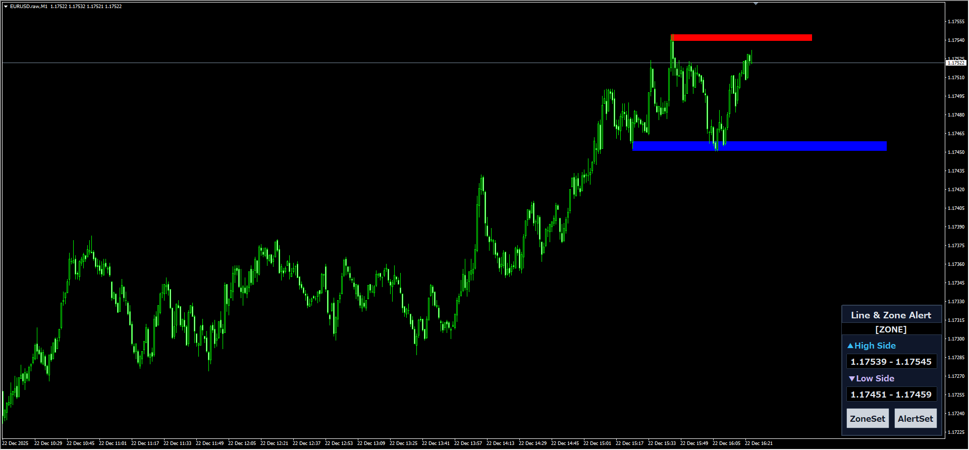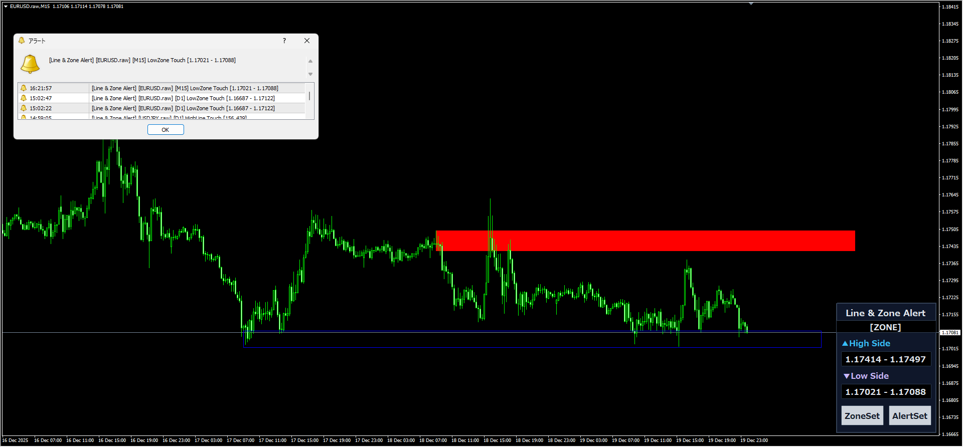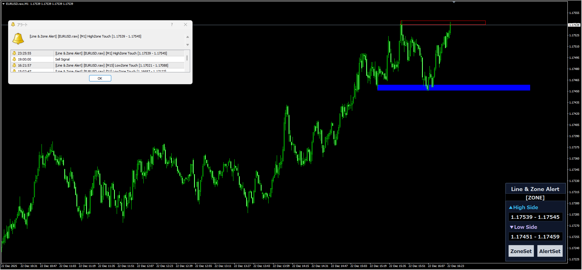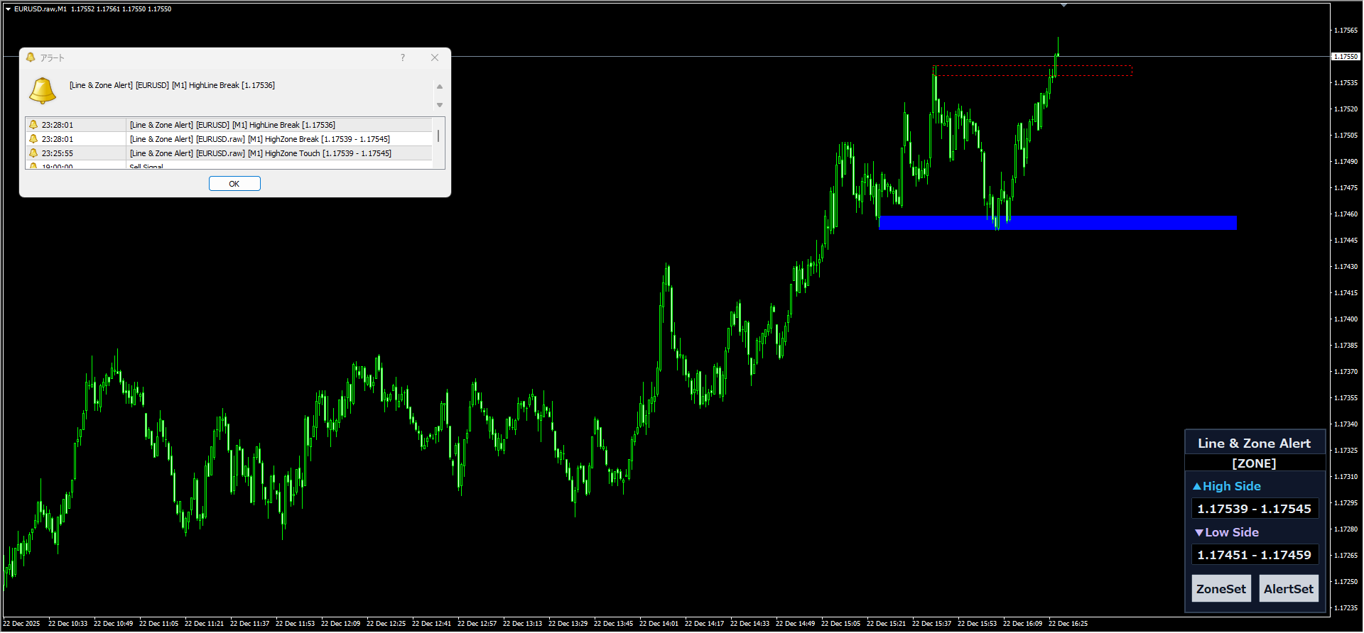 水平線・トレンドライン・ゾーン(四角形)に対して、 価格の到達・ブレイクを通知するMT4インジケーターです。 自分で引いたライン・ゾーンを監視対象とし、 条件に一致したときのみ通知を行います。■ 特徴
