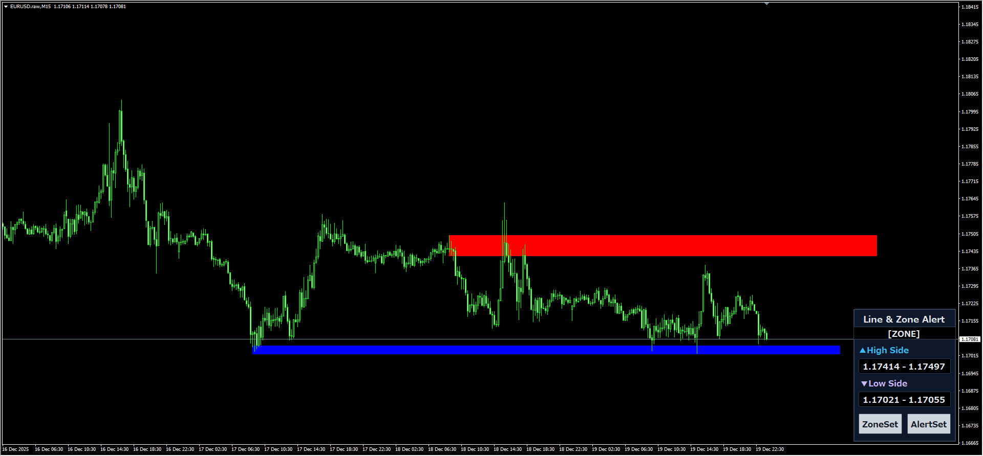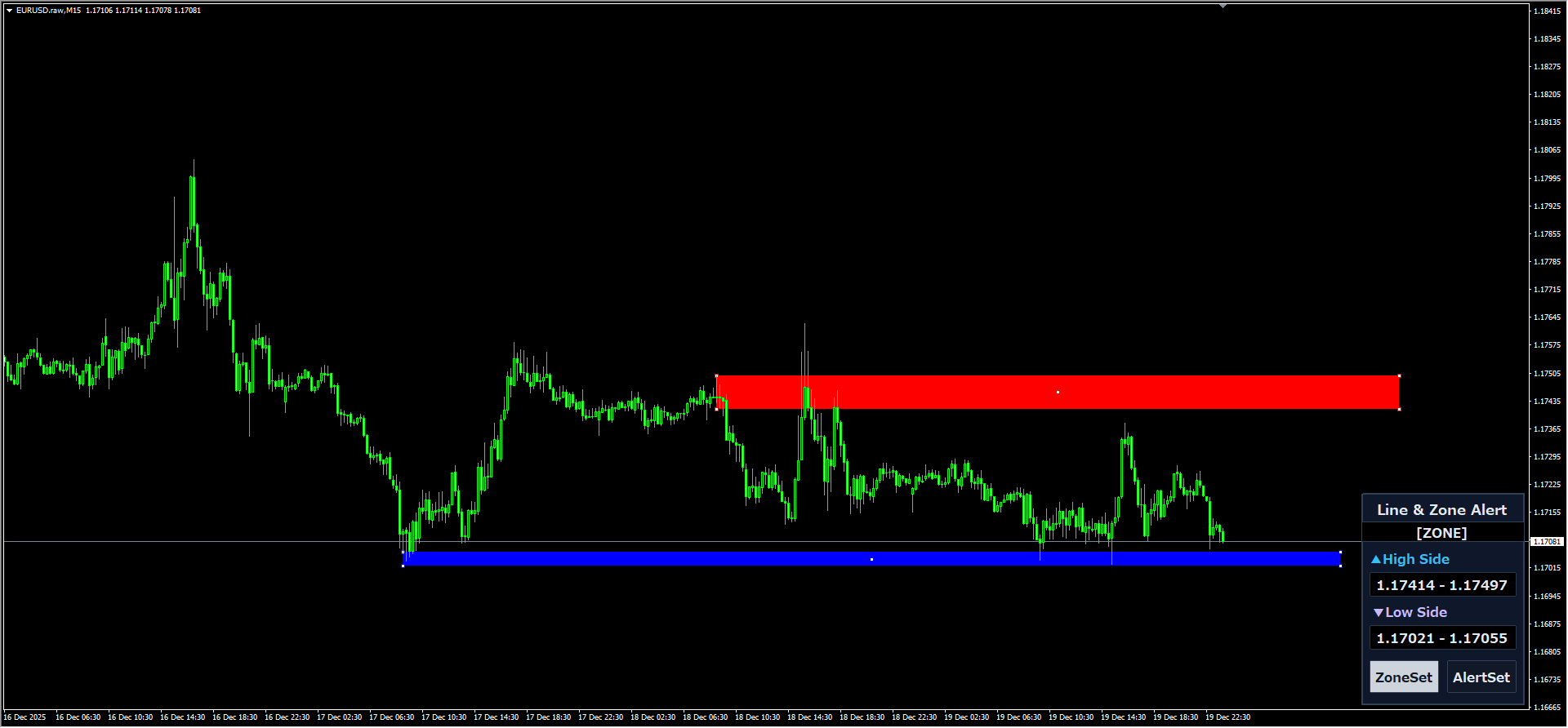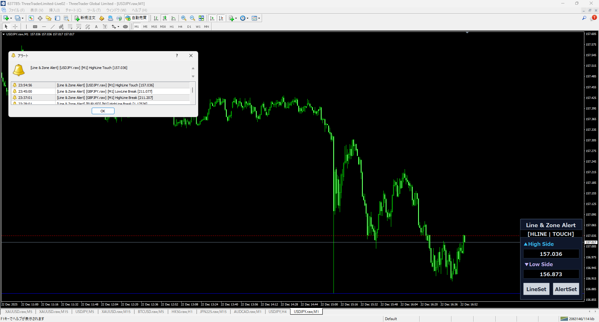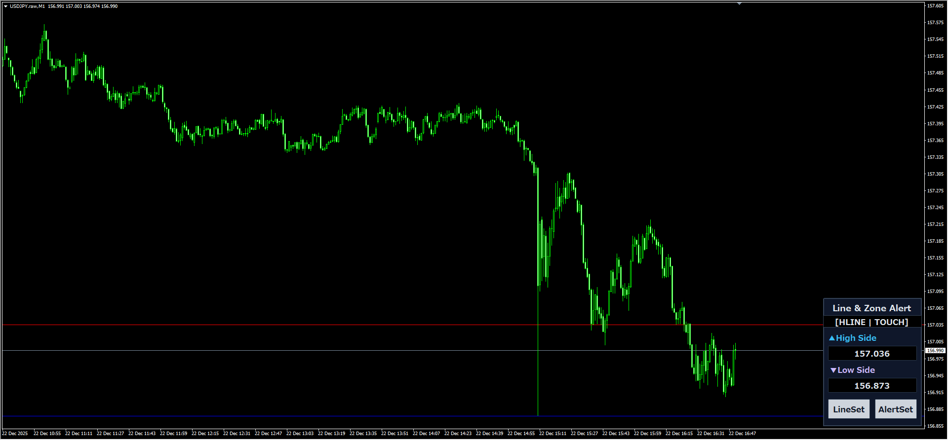 水平線・トレンドライン・ゾーン(四角形)に対して、 価格の到達・ブレイクを通知するMT4インジケーターです。 自分で引いたライン・ゾーンを監視対象とし、 条件に一致したときのみ通知を行います。■ 特徴