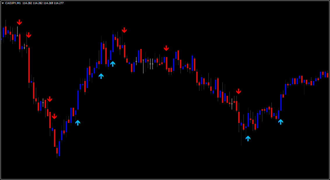 メインとなる指標は、矢印サインツールを使用しますが、ローソク足の過去本数と上昇値・下降値をもとに独自の形状で形成されます。