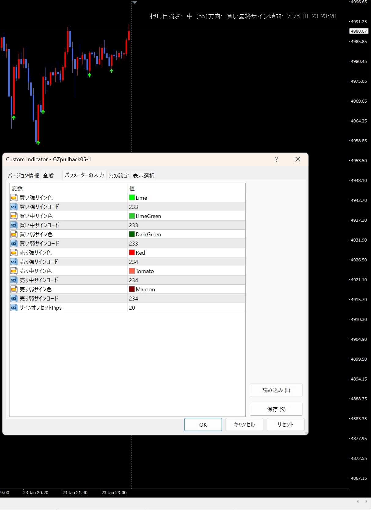 これでどれくらいの強い戻りなのかがサインの色でもわかります。